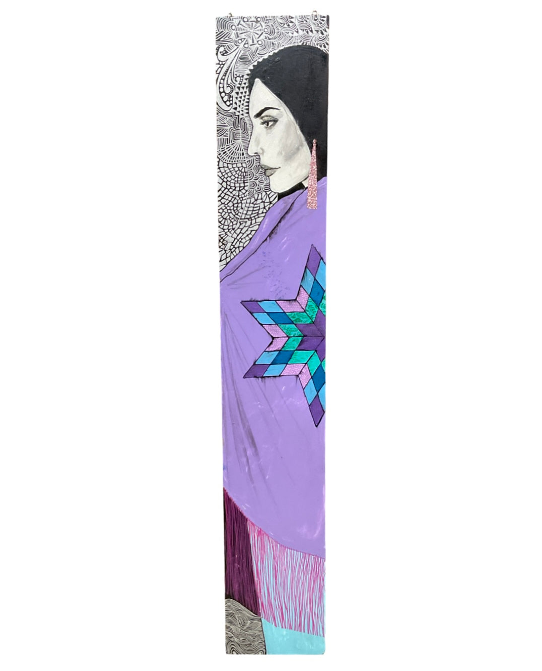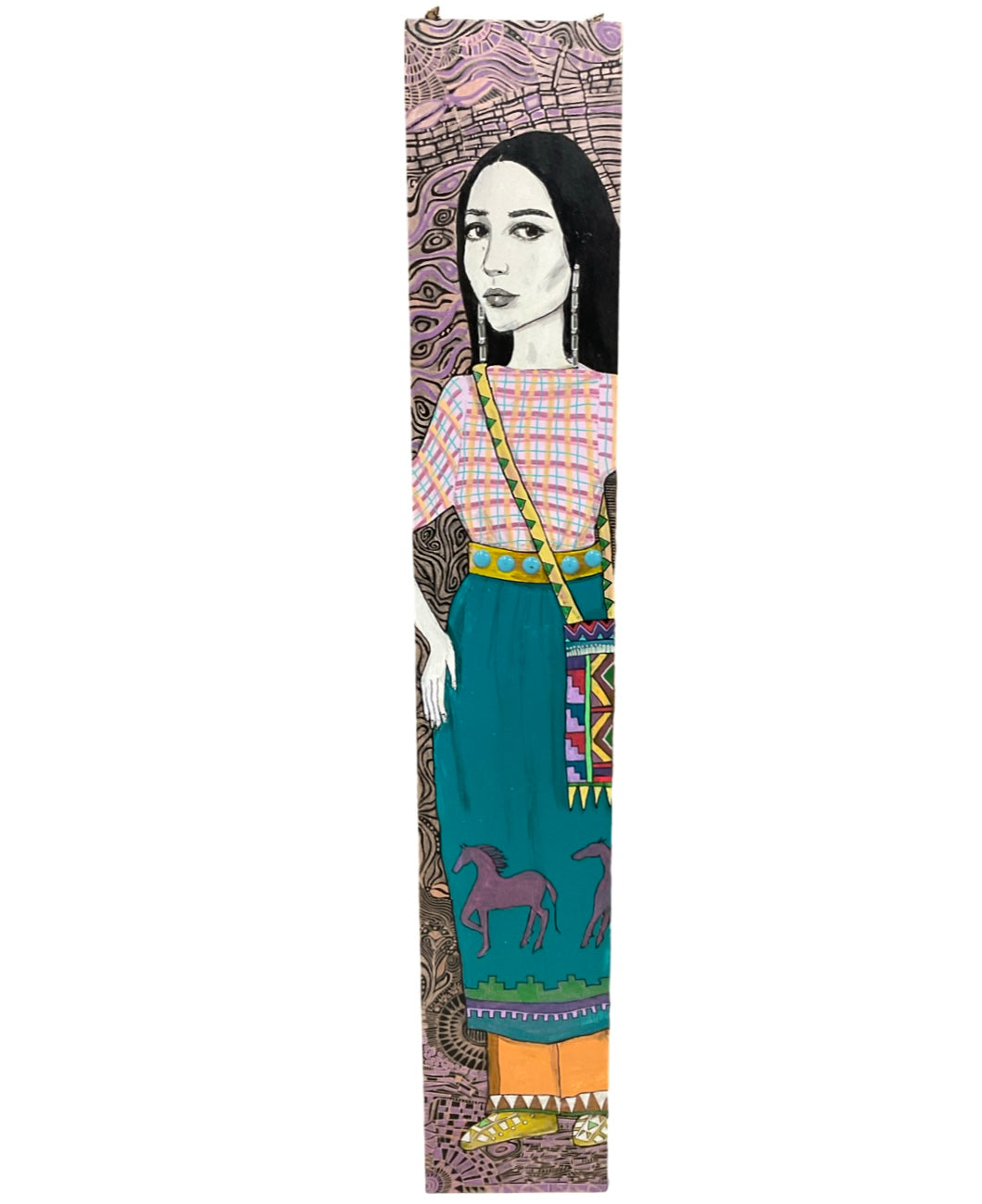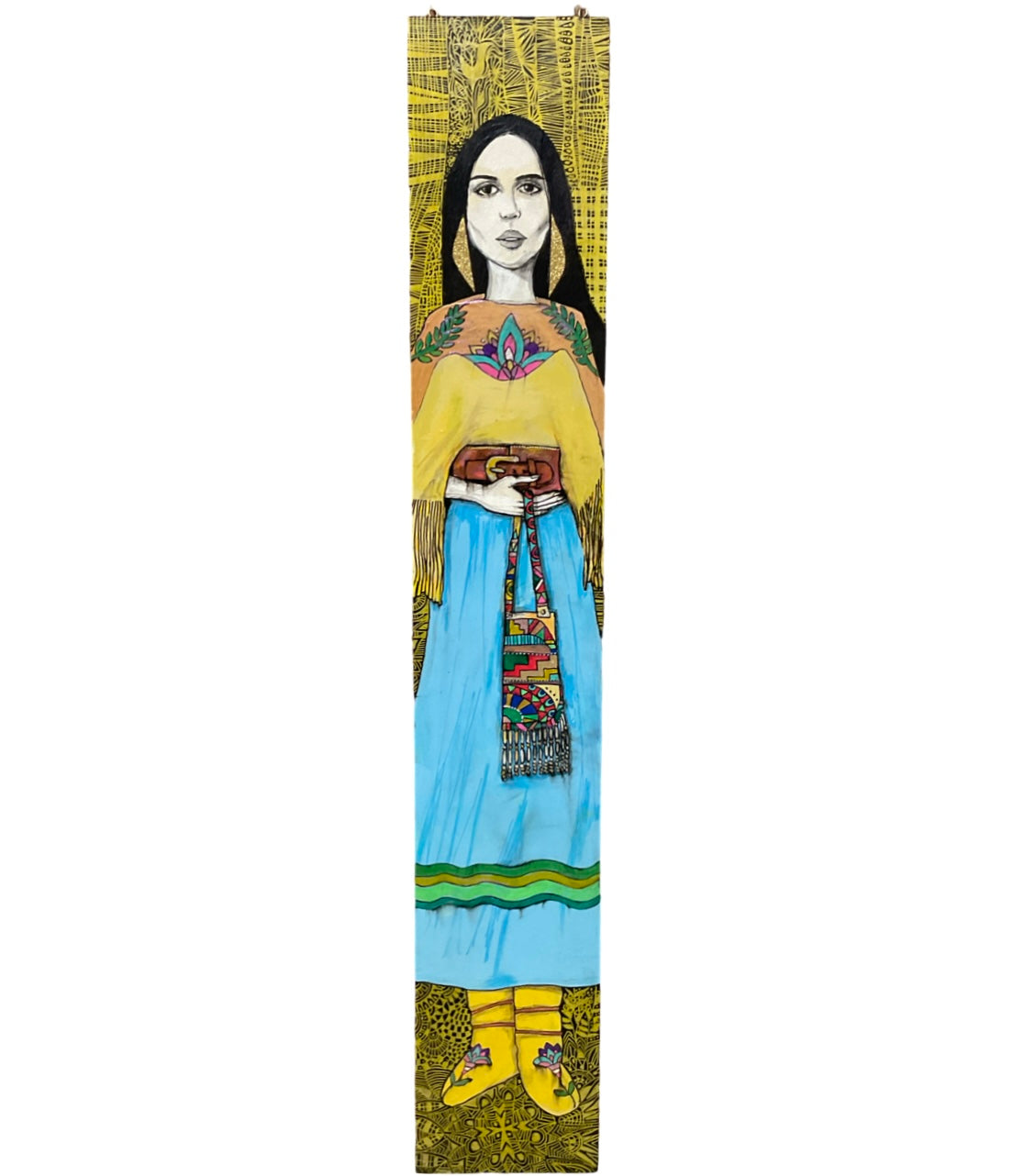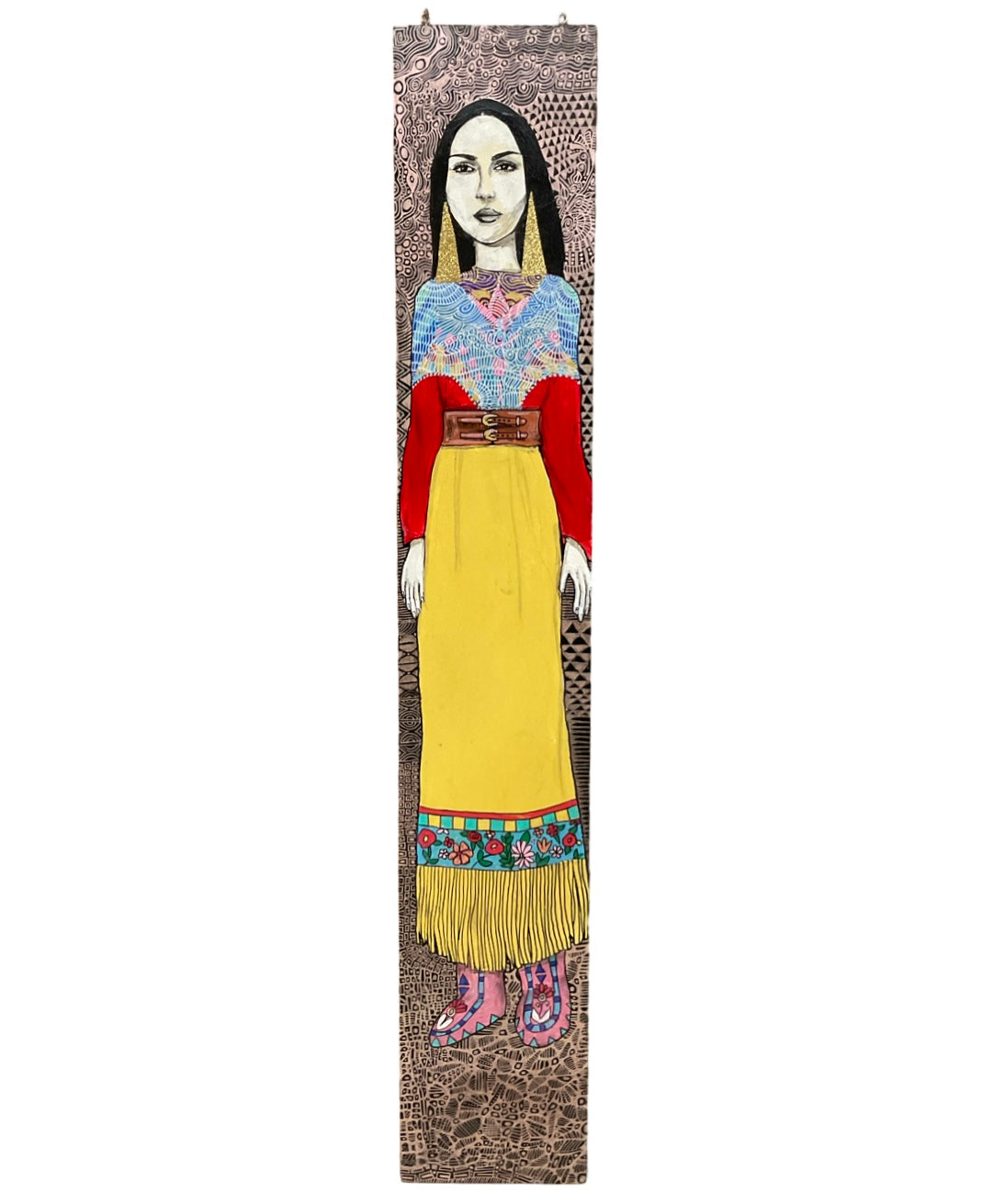 Hand painted panels featuring Lakota women's images by Lorri Ann Two Bulls. Each panel carries the name of a woman recorded in an 1800's ledger when they arrived to the reservation. "This way the names of those women live on today and are remembered" - Lorri Ann Two Bulls